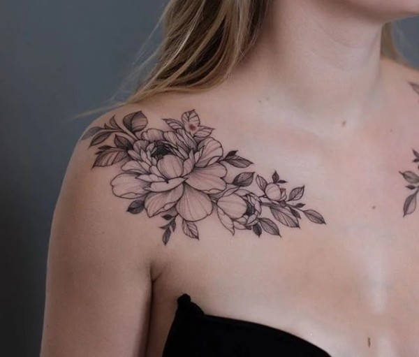 女生肩部的黑灰素花纹身作品图