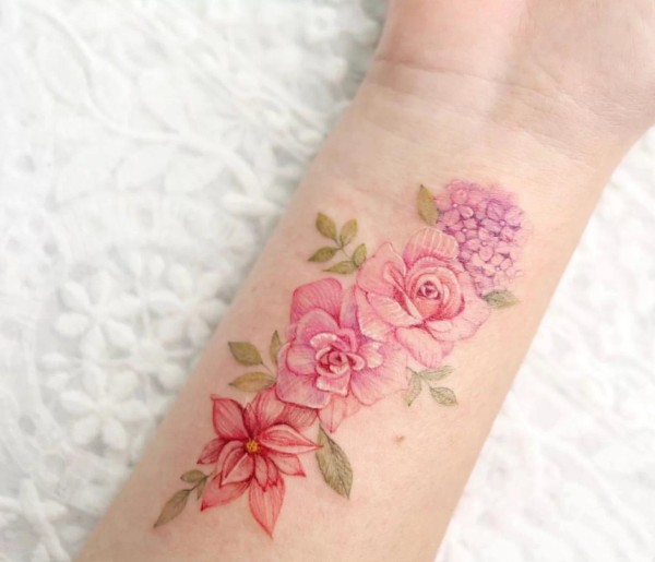 纹在手臂胳膊上的黑灰素花花卉纹身图案欣赏
