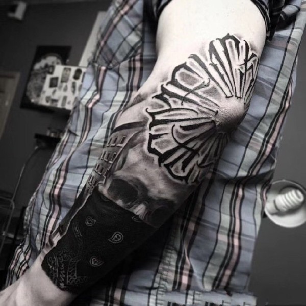 手臂new school黑色蜘蛛网和骷髅纹身图案