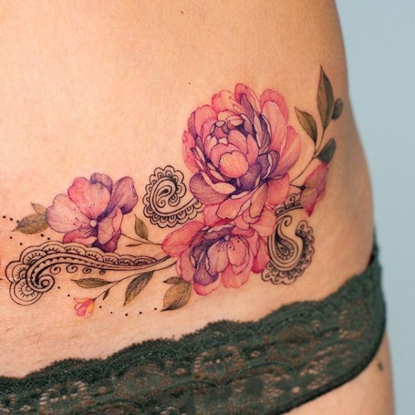 性感花朵纹身--女性大腿侧部性感的花朵纹身