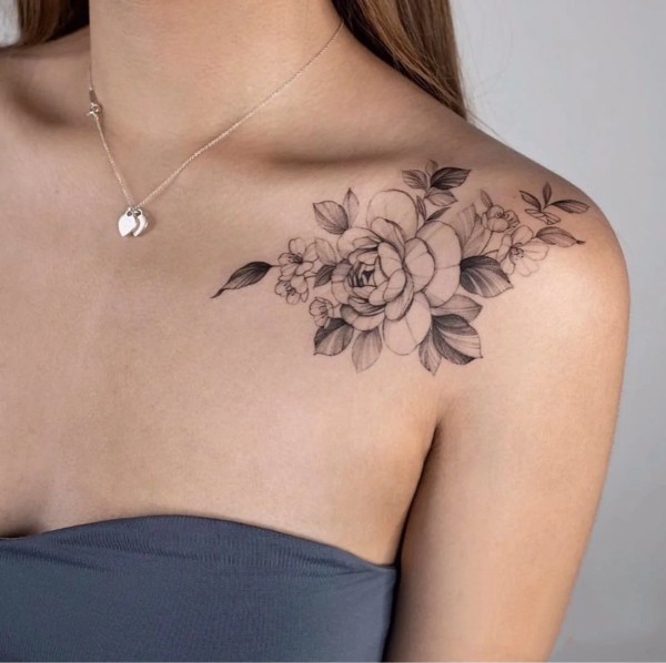 女生锁骨下的唯美花朵纹身图案