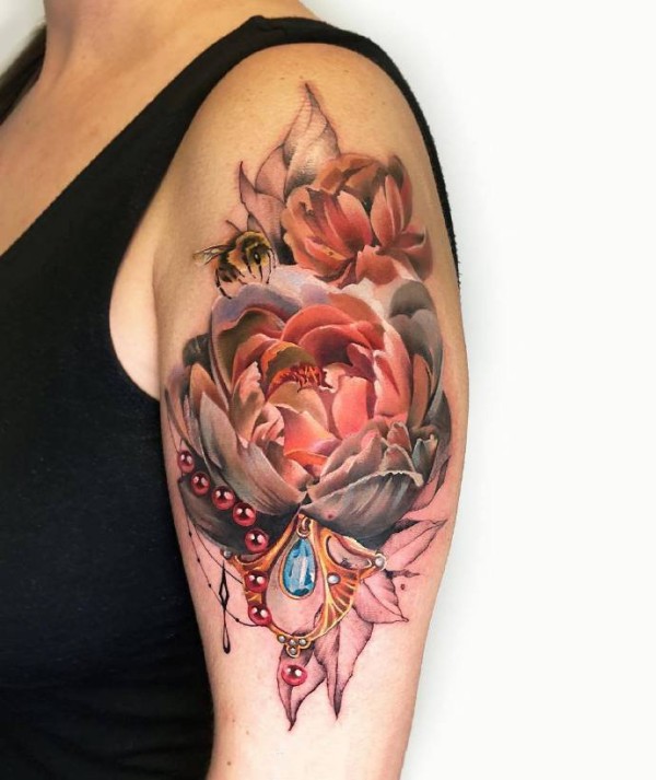 肩花纹身--一组适合肩部的黑灰肩花纹身图案欣赏