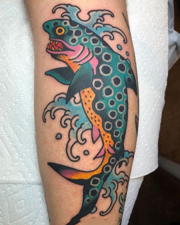 蝙蝠,幼狮,鲤鱼组成的花臂纹身