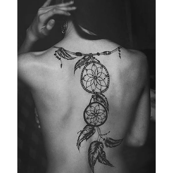 女生背部脊椎处漂亮的黑灰点刺纹身图案欣赏