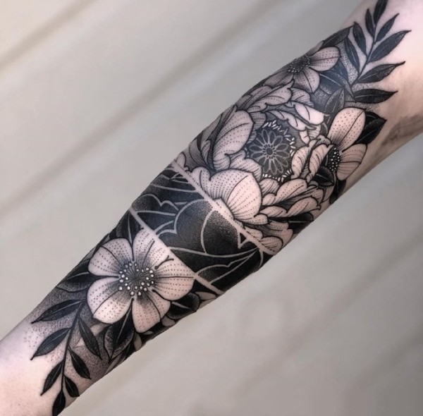大臂素花纹身 9款女士的大臂黑灰花朵植物纹身图案