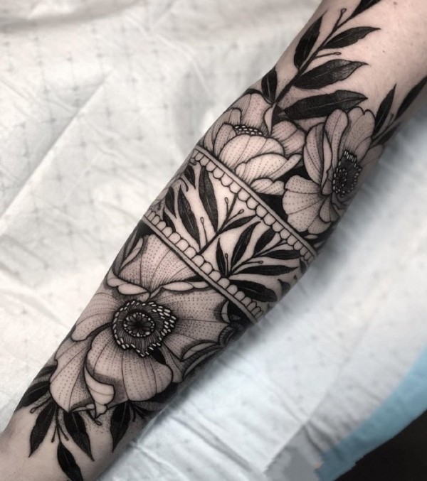 大臂素花纹身 9款女士的大臂黑灰花朵植物纹身图案