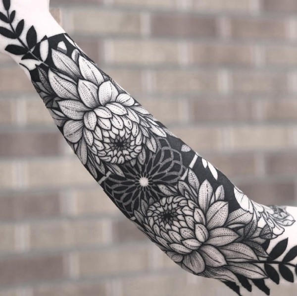 大臂素花纹身 9款女士的大臂黑灰花朵植物纹身图案