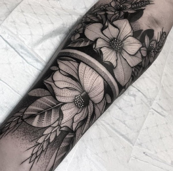 大臂素花纹身 9款女士的大臂黑灰花朵植物纹身图案