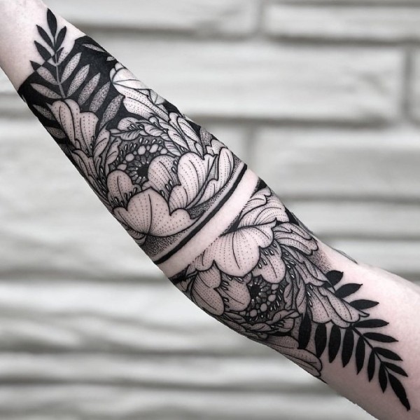 大臂素花纹身 9款女士的大臂黑灰花朵植物纹身图案