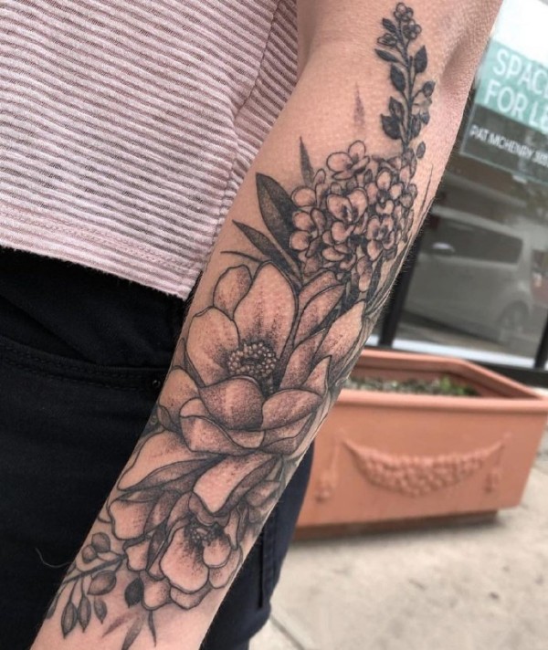 大臂素花纹身 9款女士的大臂黑灰花朵植物纹身图案