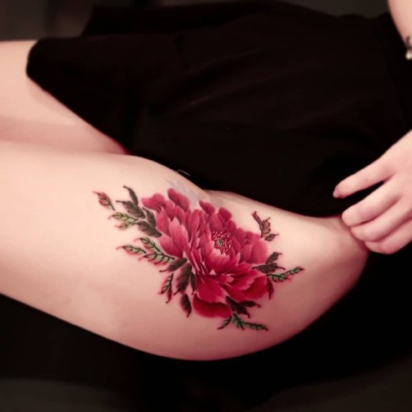 性感花朵纹身--女性大腿侧部性感的花朵纹身