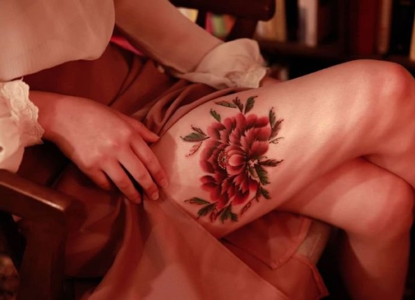 性感花朵纹身--女性大腿侧部性感的花朵纹身