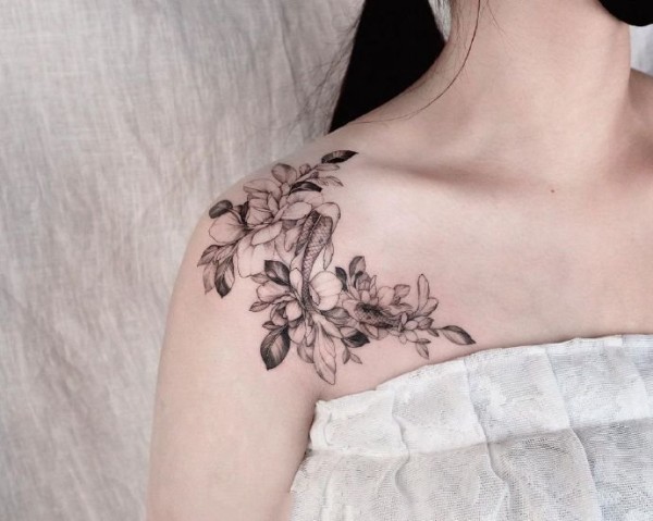 大臂素花纹身 9款女士的大臂黑灰花朵植物纹身图案