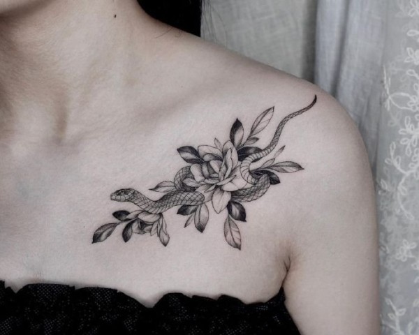 女孩子锁骨肩部的素花纹身图欣赏
