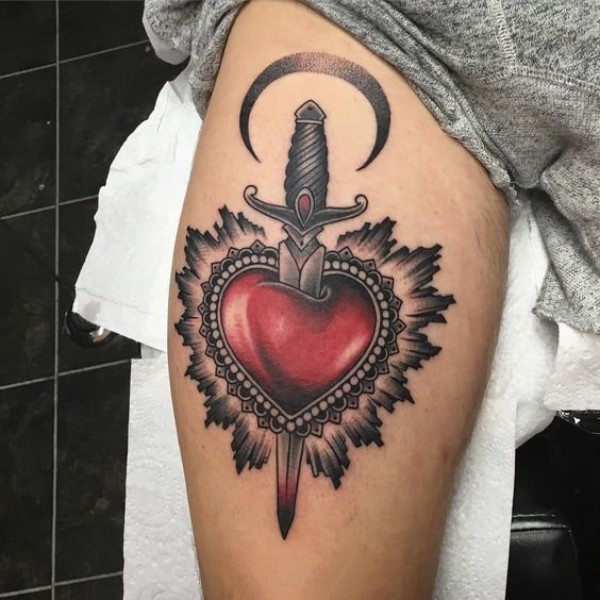 女生锁骨下黑灰素描点刺技巧创意比心纹身图片