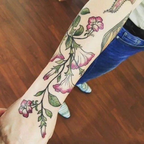 纹在手臂胳膊上的黑灰素花花卉纹身图案欣赏