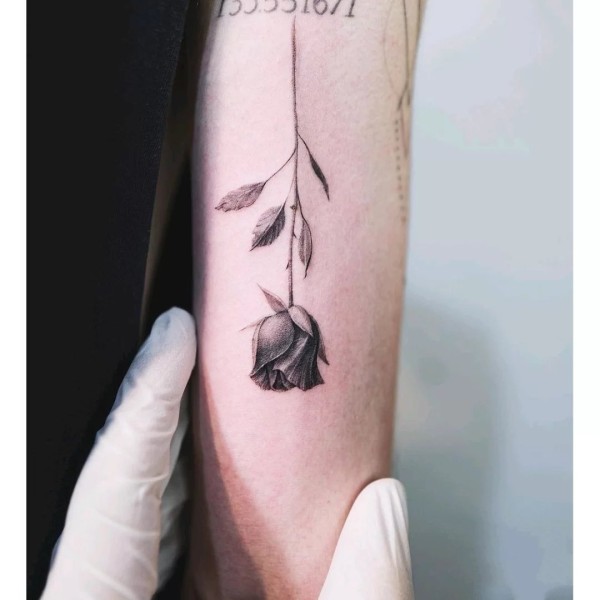 纹在手臂胳膊上的黑灰素花花卉纹身图案欣赏