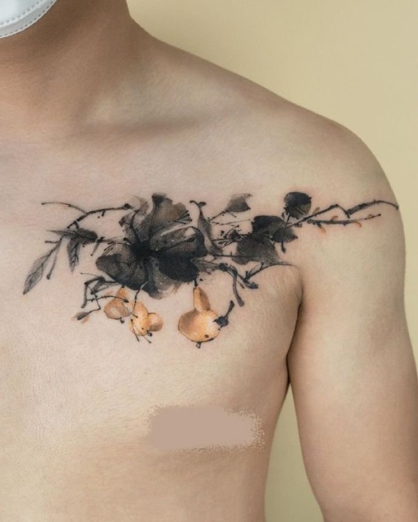 女生肩部锁骨的小清新水彩花朵纹身图案