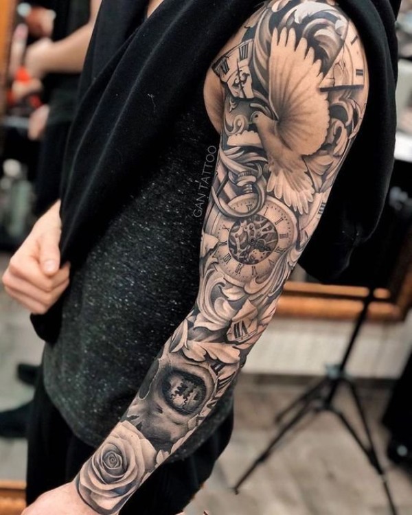 欧美花臂纹身_22张霸气黑灰欧美大黑花臂纹身图案作品图片