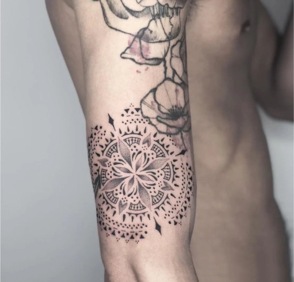 迷人的黑灰色曼陀罗图案纹身来自于纹身师曼纽尔