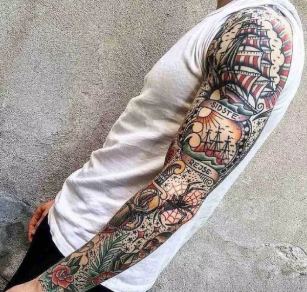 传统风格的一组男性花臂和花腿纹身图案欣赏