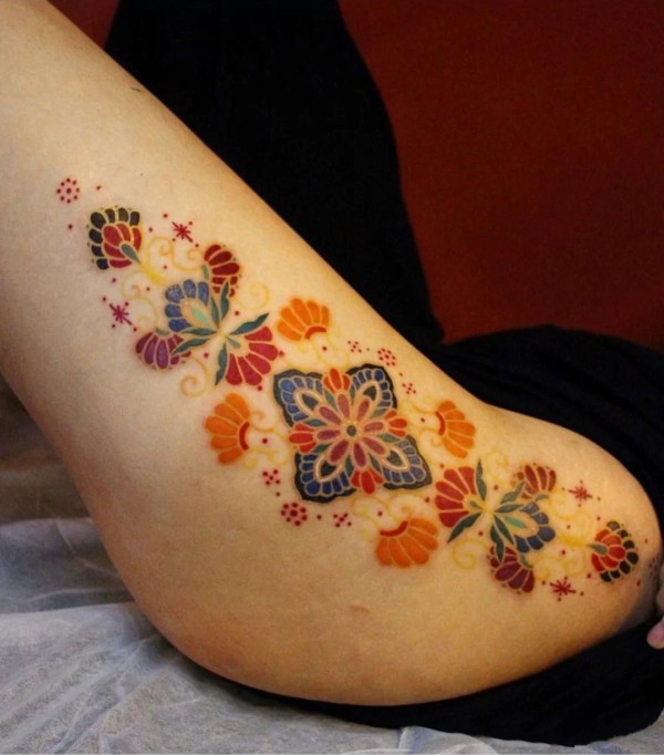 女孩性感大腿上漂亮的装饰风格曼陀罗花纹身图案