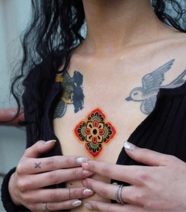 女性胸骨下漂亮的装饰纹身图案来自泽利娜