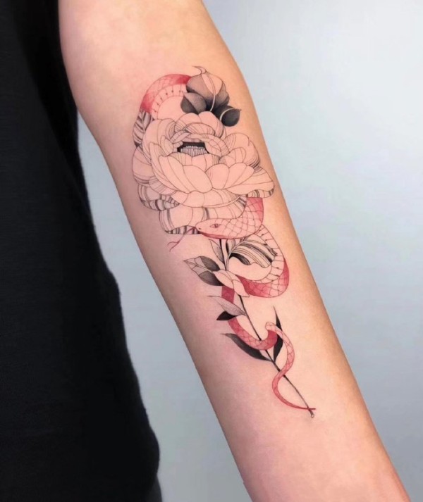 日式彩色蛇与牡丹传统纹身图案手稿