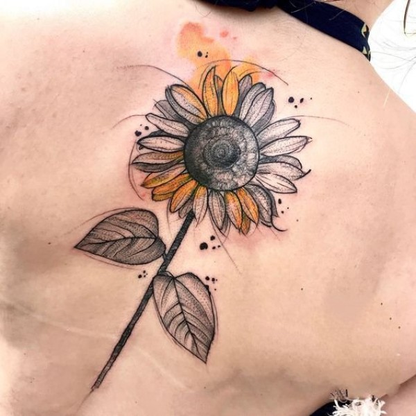 向日葵纹身图片 女生后背上彩色的向日葵纹身图片