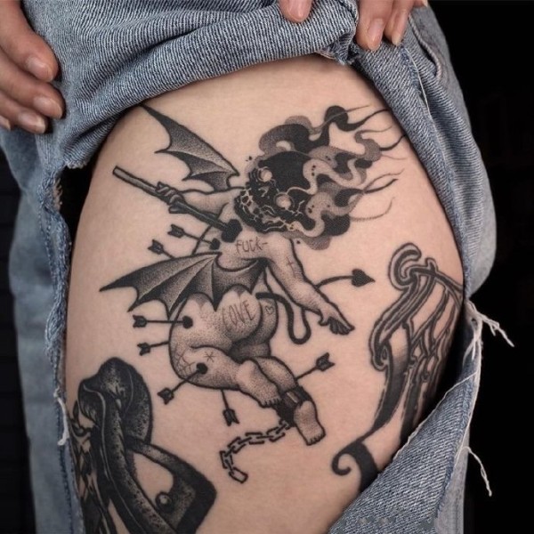 腿部黑灰天使纹身图案_天使纹身图案大全_纹身图吧