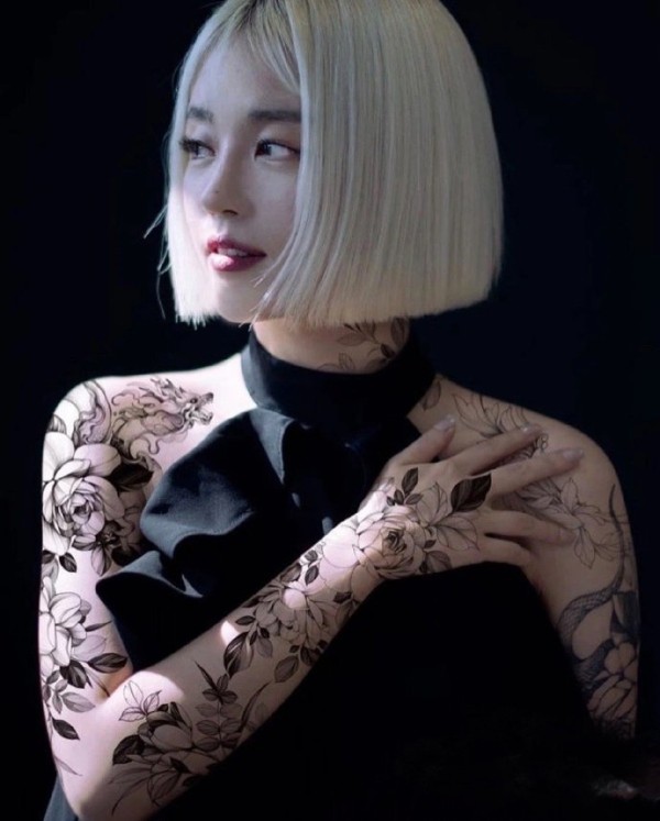 大臂素花纹身 9款女士的大臂黑灰花朵植物纹身图案