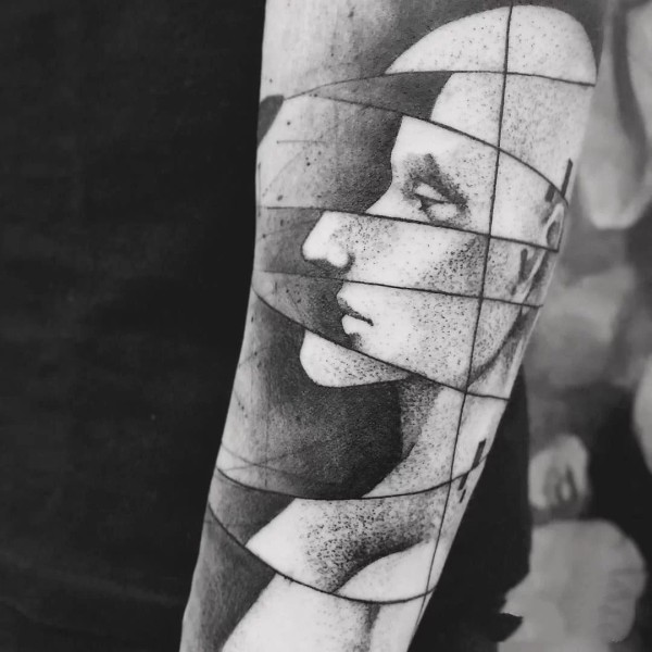 大腿上黑白灰风格点刺身抽象线条人物肖像纹身图片