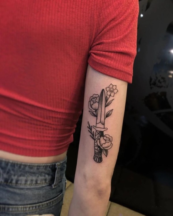 纹在手臂上的黑灰冷兵器匕首纹身图