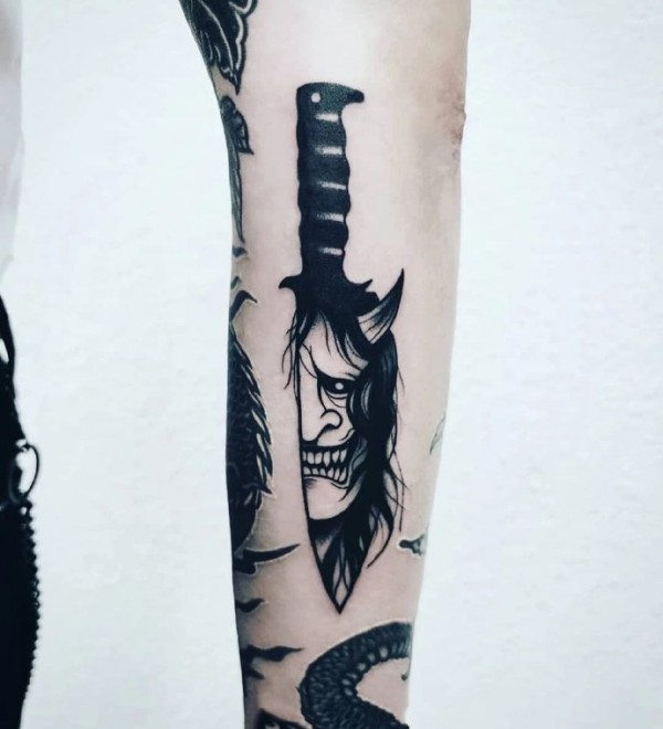 纹在手臂上的黑灰冷兵器匕首纹身图