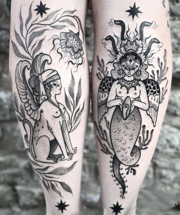 一组适合小腿和手臂的黑灰点刺纹身图案作品欣赏