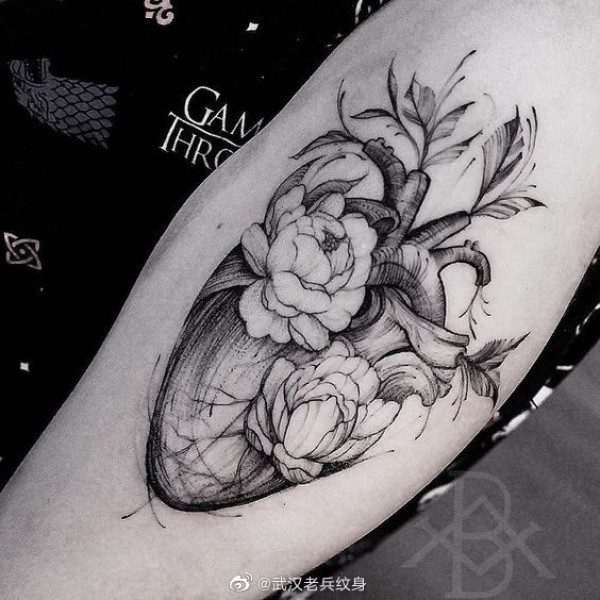 心脏纹身图案 女生手臂上黑灰纹身心脏纹身图案