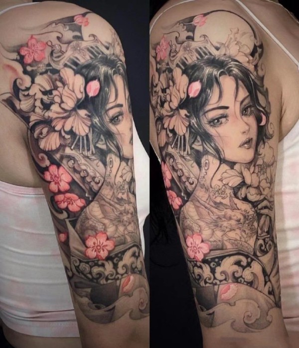 日本艺妓纹身图 黑灰或彩绘的日本艺妓包臂纹身图案