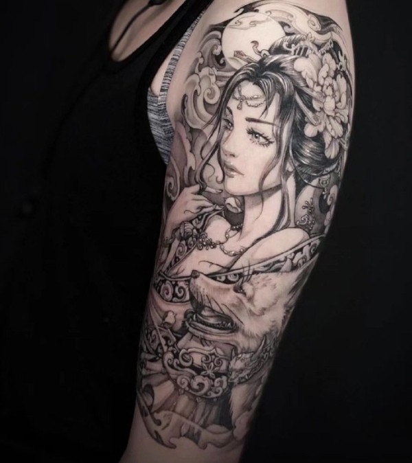 日本艺妓纹身图 黑灰或彩绘的日本艺妓包臂纹身图案