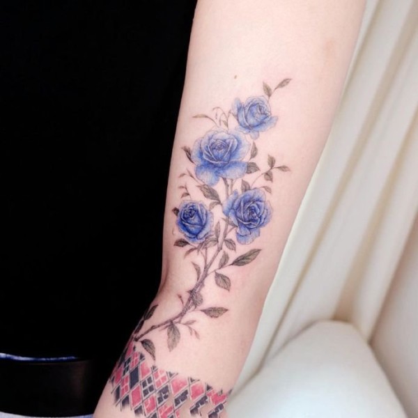 纹在手臂胳膊上的黑灰素花花卉纹身图案欣赏