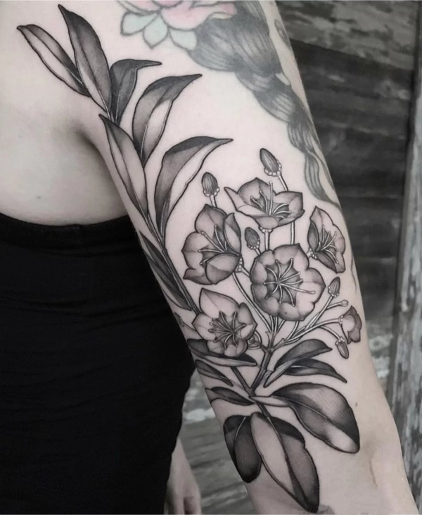 大臂素花纹身 9款女士的大臂黑灰花朵植物纹身图案