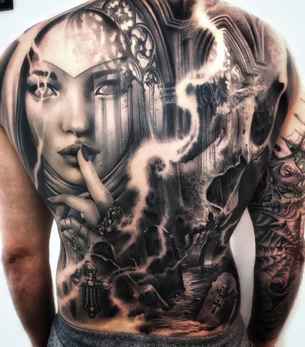 9张欧美风的黑灰满背纹身图片