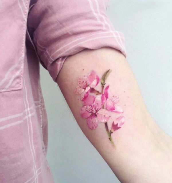 女性身上的一组粉色花卉纹身图片