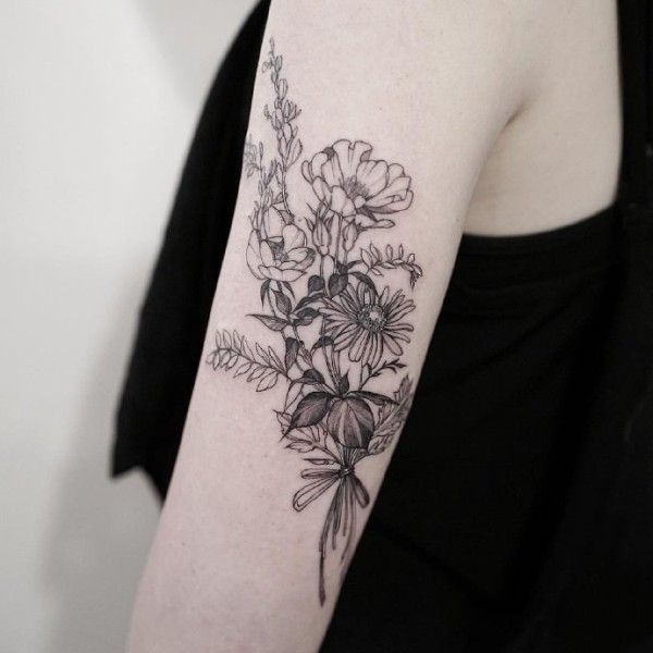 大臂素花纹身 9款女士的大臂黑灰花朵植物纹身图案
