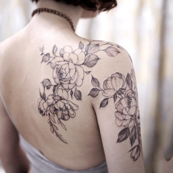 大臂素花纹身 9款女士的大臂黑灰花朵植物纹身图案