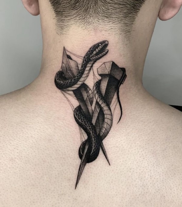 男生胸部黑色点刺几何简单线条小动物蛇和鳄鱼纹身图片