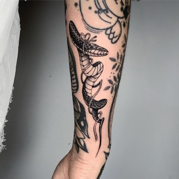 黑色和白色手臂眼镜蛇纹身动物几何点刺纹身图案