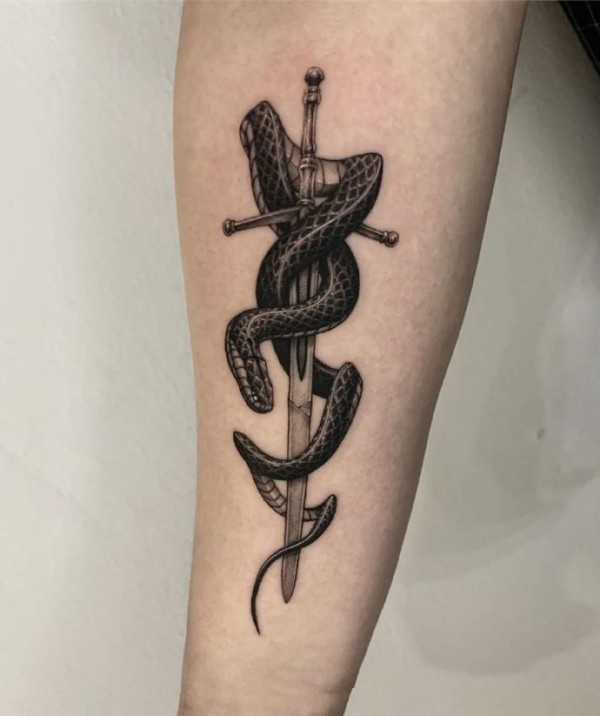蛇绕匕首school彩色纹身图案手稿