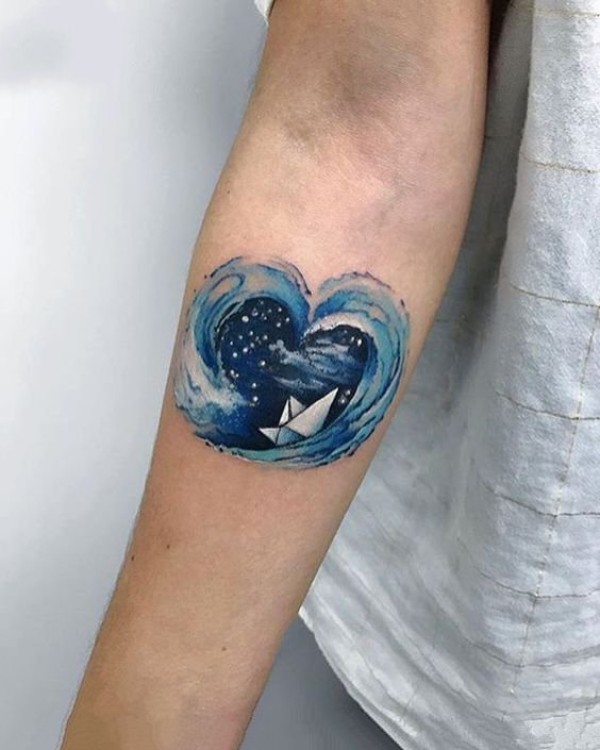 school欧美手帆船海浪玫瑰纹身图案手稿