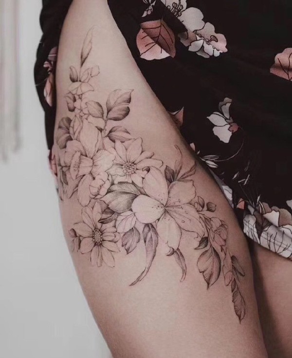 性感大腿纹身 女士大腿处性感的花花纹身图片