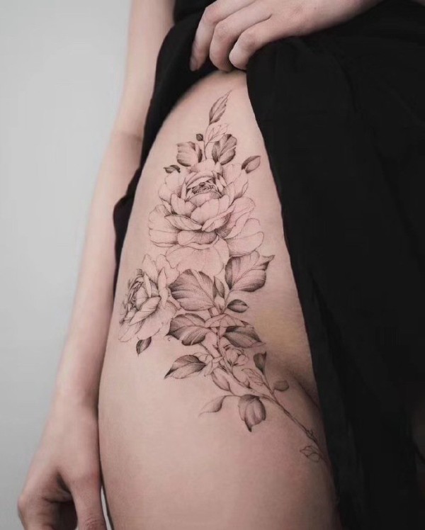 性感大腿纹身 女士大腿处性感的花花纹身图片